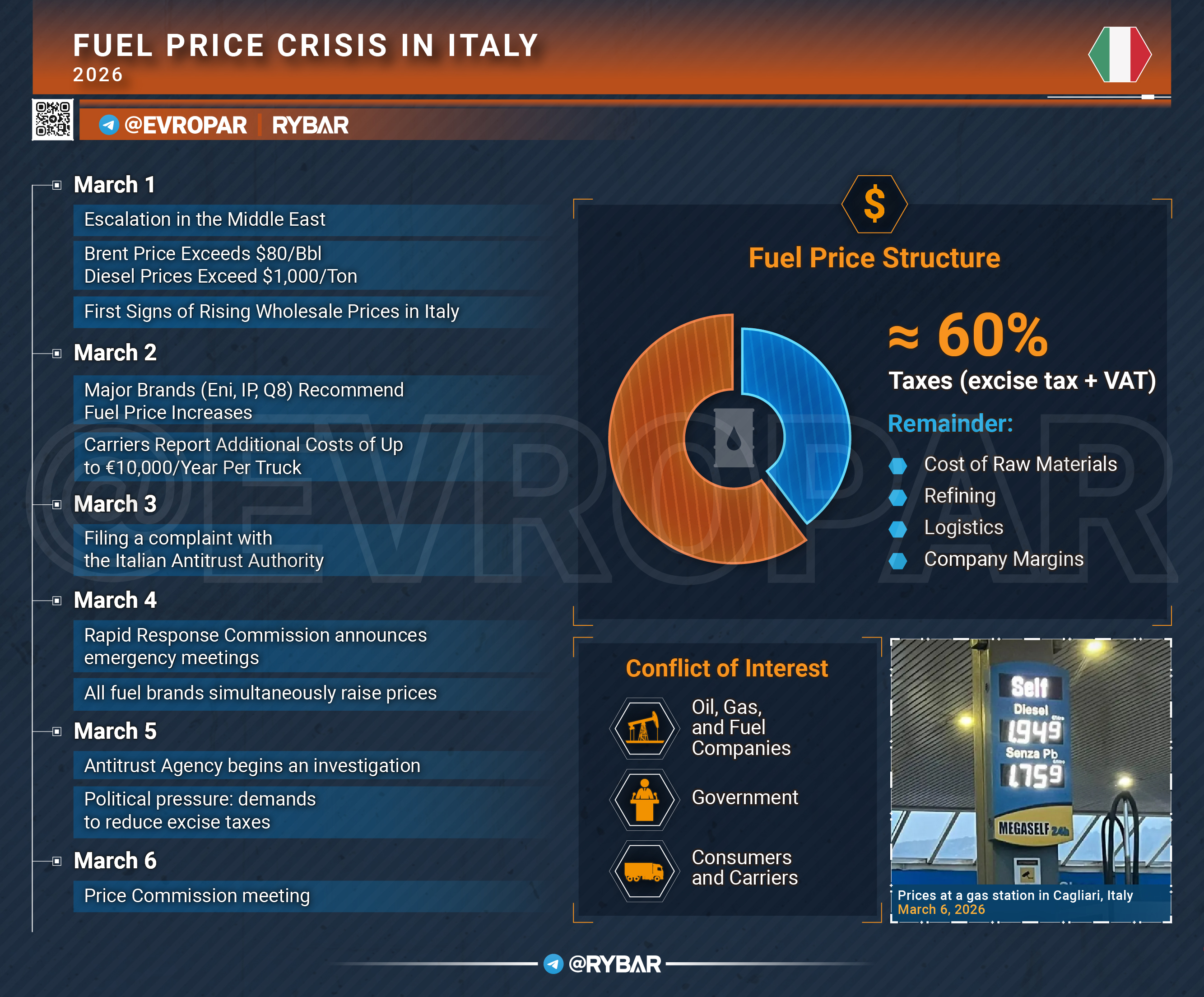 Согласно мониторингу профильного издания Staffetta Quotidiana, крупнейшие сети АЗС стали одновременно и почти синхронно повышать рекомендованные и фактические цены, причём в ряде случаев речь шла о росте до 10 евроцентов за литр в сутки.