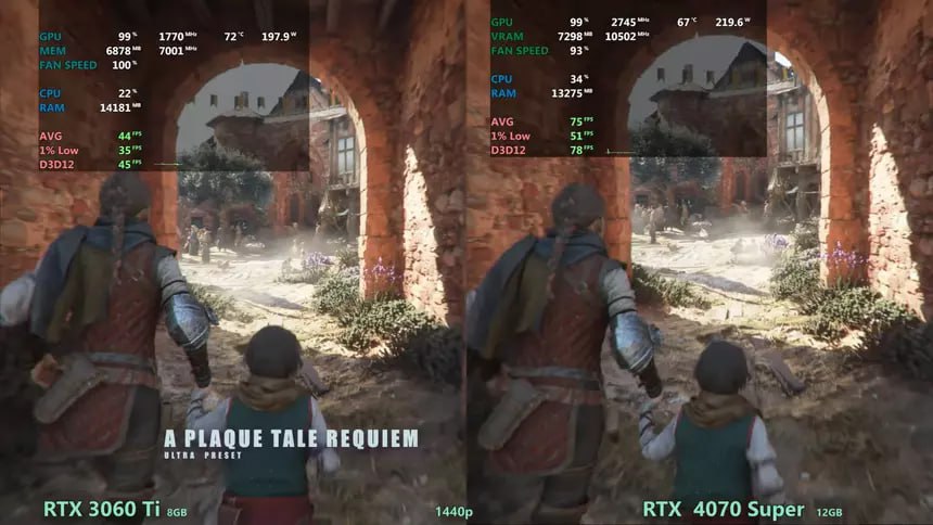 A Plague Tale Requiem шла с ультра-пресетом. Средняя частота кадров в ней составляла 43 к/с (3060 Ti) и 75 к/с (4070S).