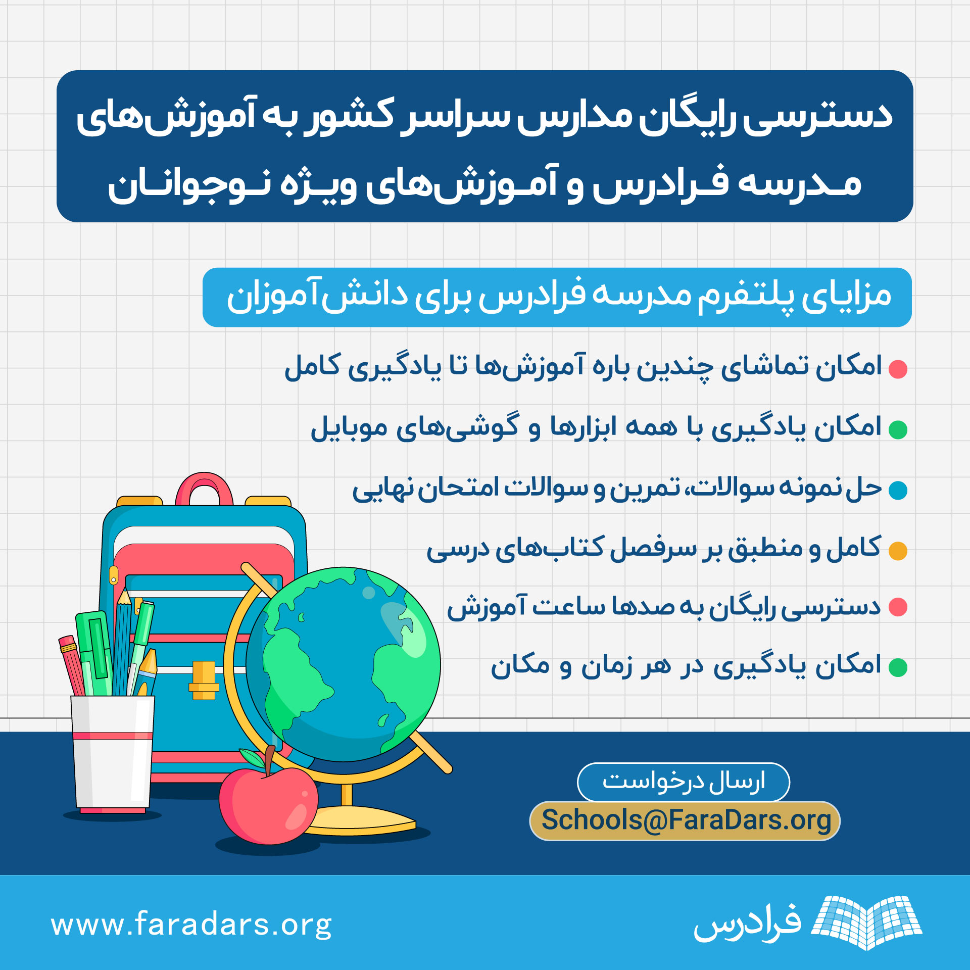 📌 مدارسی که تمایل به تجهیز سیستم یادگیری خود به آموزشهای دانشآموزی و نوجوانان فرادرس را دارند، میتوانند درخواست خود را به آدرس ایمیل زیر ارسال کنند: