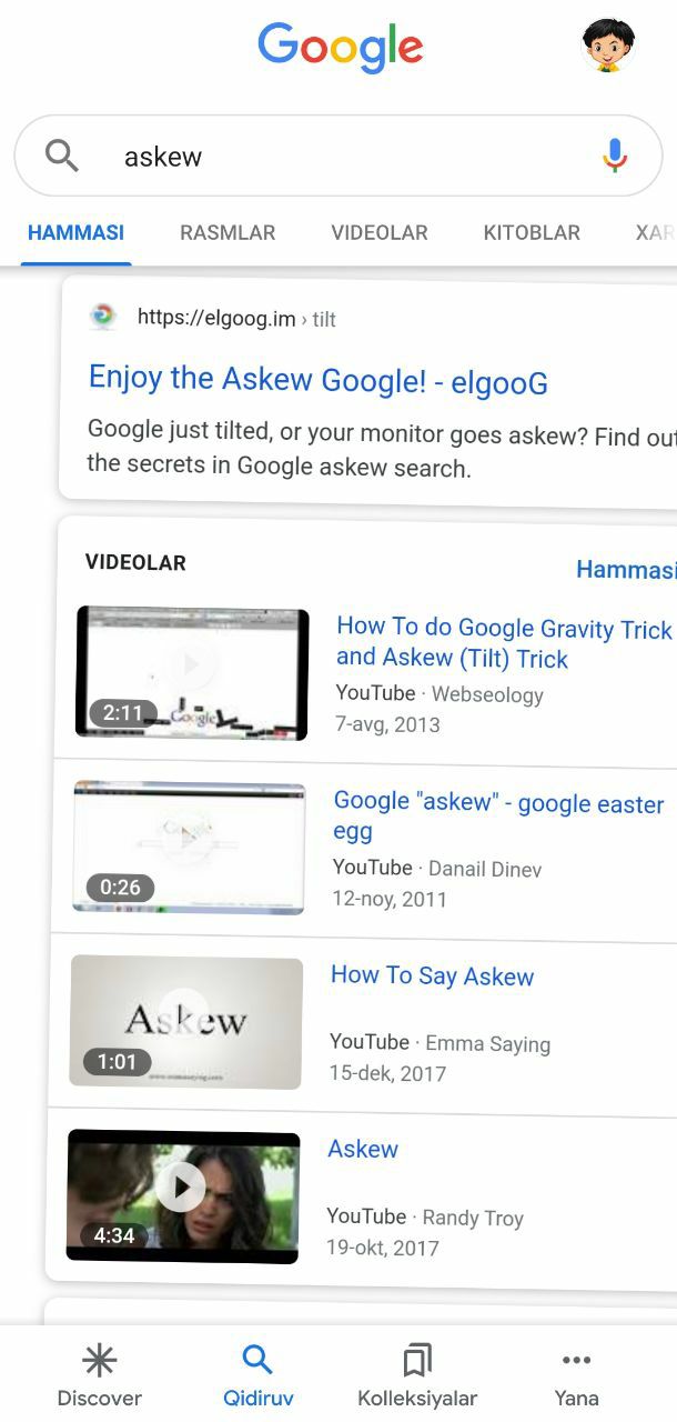 www.google.com sahifasiga o'tib "askew" so'ziga qidiruv bering.(Askew - ing: egri). Natijada, sahifa o'nga egiladi.