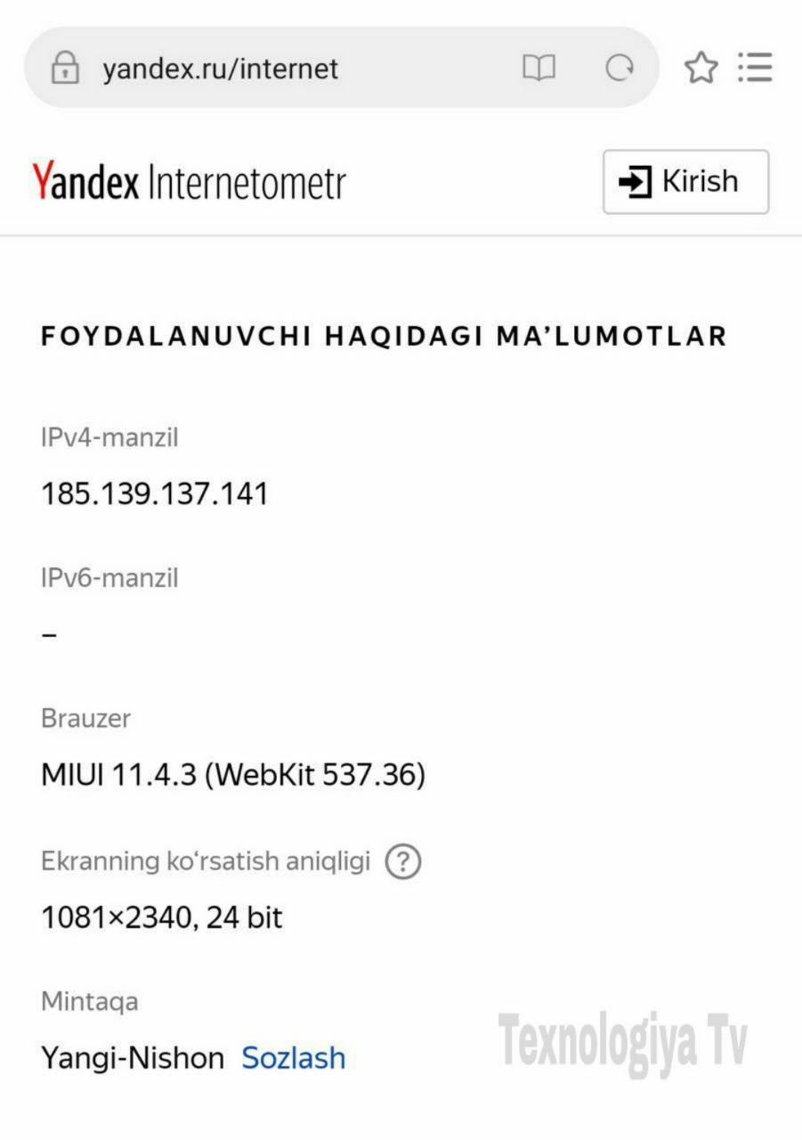 https://yandex.ru/internet sizga ulanishning IP-manzilini, provayder nomini va manzil haqida ma'lumotni topishga yordam beradi.