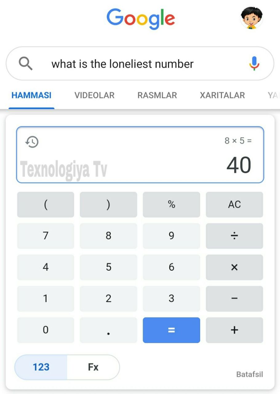 Google.com sahifasiga o'ting va qidiruv joyiga "what is the loneliest number" ni qidiruvga bering va kalkulyatordan google'da foydalaning.