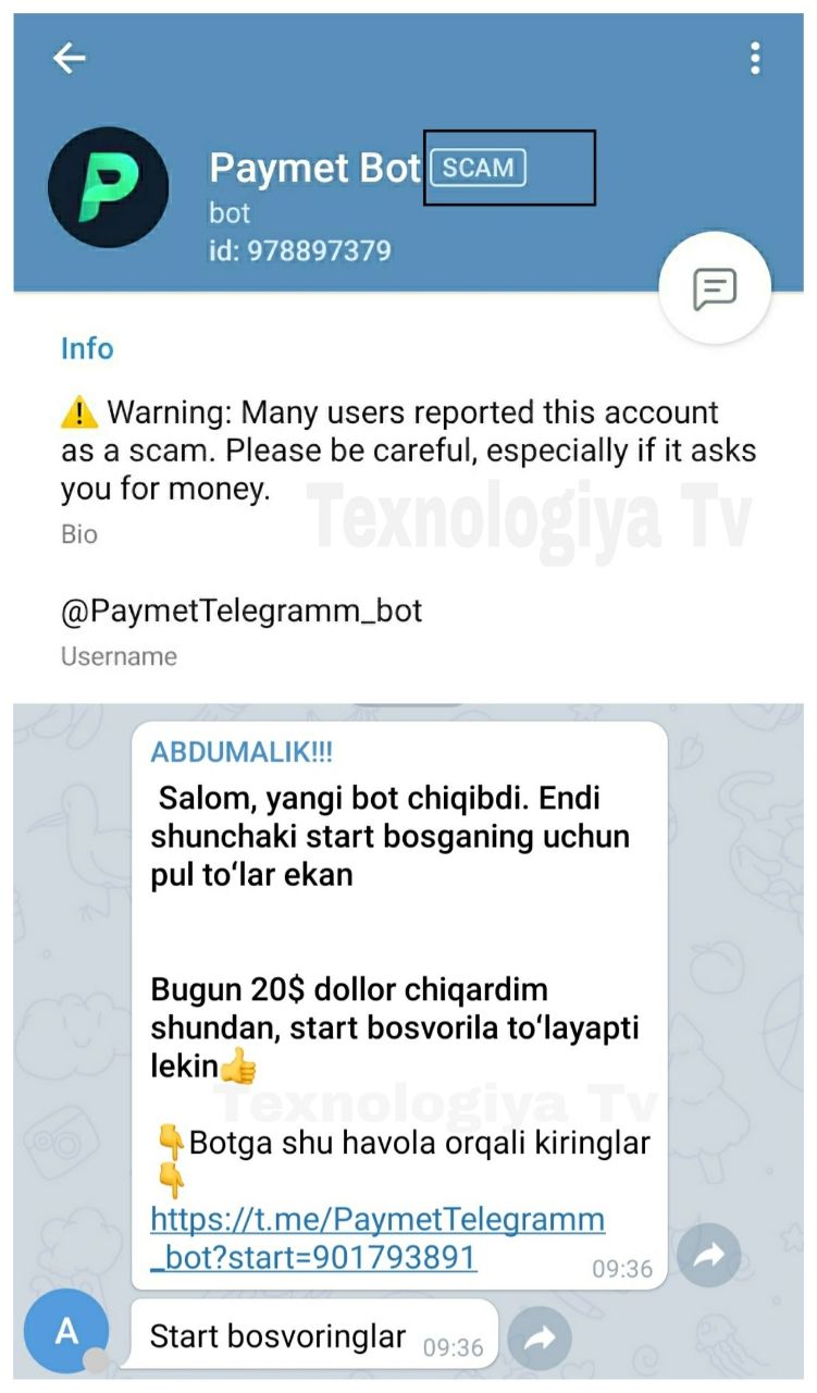 «SCAM» — ing: "qalloblik", "firibgarlik" degan ma'nolarni bildiradi. Bu belgi telegram botlari, kanallari va foydalanuvchilarga berilishi mumkin. «SCAM» belgisini olgan botlarni, telegram foydalanuvchilari guruhlarga tarqatishmoqda (rasmga qarang)