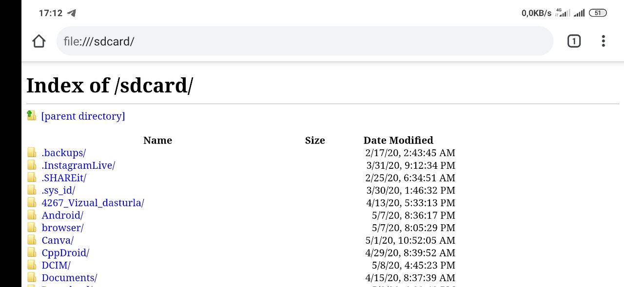 file:///sdcard/» ni kirgizing va qidiruv bering.Agar format qo'llab-quvvatlansa, qurilmaning fayl tizimi ekranda to'liq namoyon bo'ladi.