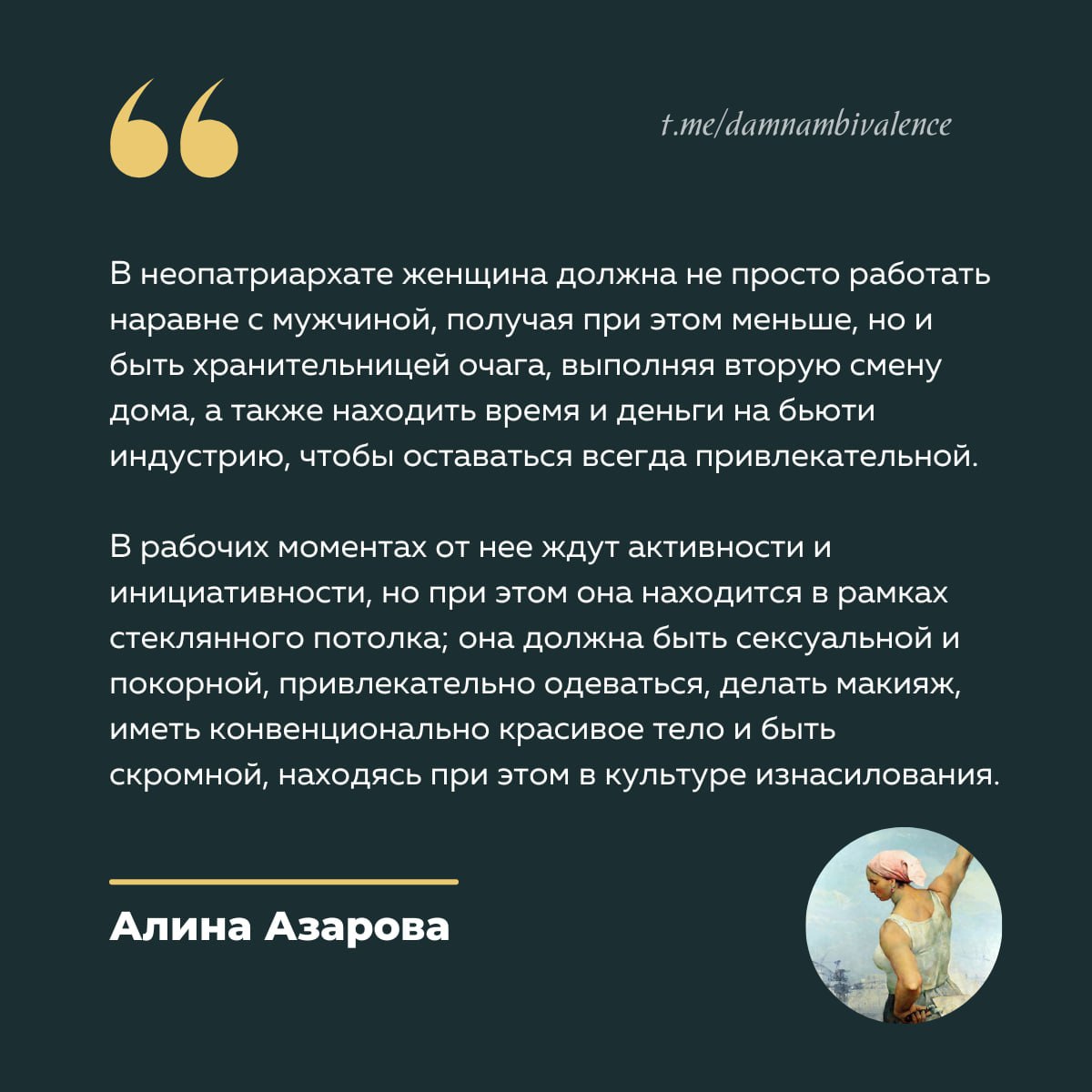 А я как раз прочитала великолепную статью Алины Азаровой "Неопатриархат как основа формирования новой женской субъектности" в сборнике "Актуальные проблемы современной науки" (2021 г.).