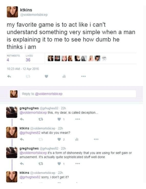 Мне же кажется, что понятие менсплейнинга гораздо шире объяснений «сверху вниз» без единой мысли, что женщина может быть компетентна в вопросе или вообще являться экспертом по предмету обсуждения. Менсплейнинг — это манера разговора, проистекающая из уверенности мужчин в собственных сверхценности, всецелокомпетентности и сногсшибательности.