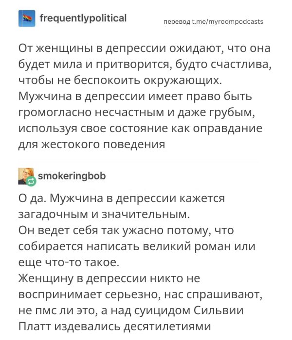Ни одна женщина не получит сочувствия, если будет вести себя так, как ведет себя травмированный мужик. Ему можно ругать всех женщин, если ему кто-то отказала в сексе - и никто не обвинит его в мизогинии. Он имеет право бухать, прогуливать работу, хамить домашним и срывать зло на обслуживающем персонале, проигрывать деньги, брать кредиты - потому что первые сорок лет жизни мальчика очень сложные, будем к нему снисходительны.