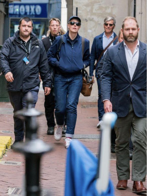 Фото дня на передовице The Times. Профессорка философии Кэтлин Сток в сопровождении секьюрити в Оксфордском университете.