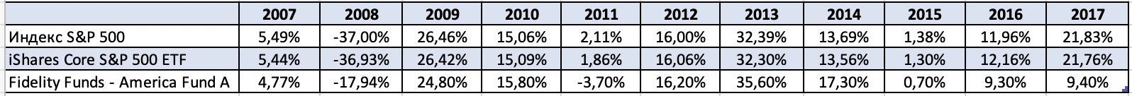 Большинство ETF’s – индексные, то есть всегда точно следуют за Индексом, который лежит в их основе, и в этом их преимущество перед зарубежными взаимными фондами и нашими ПИФами. В качестве примера предлагаю сравнить ETF iShares Core S&P 500 (IVV) и зарубежный фонд Fidelity Funds — America Fund.