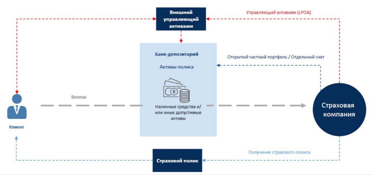 💎 Согласно приложенной схеме, у клиента при инвестиционном страховании по сути на руках лишь страховой полис, как право требования к компании при наступлении страхового случая. Однако, все активы полиса инвестируются через открытый частный портфель/отдельный счет от имени страховой компании, но в интересах клиента.