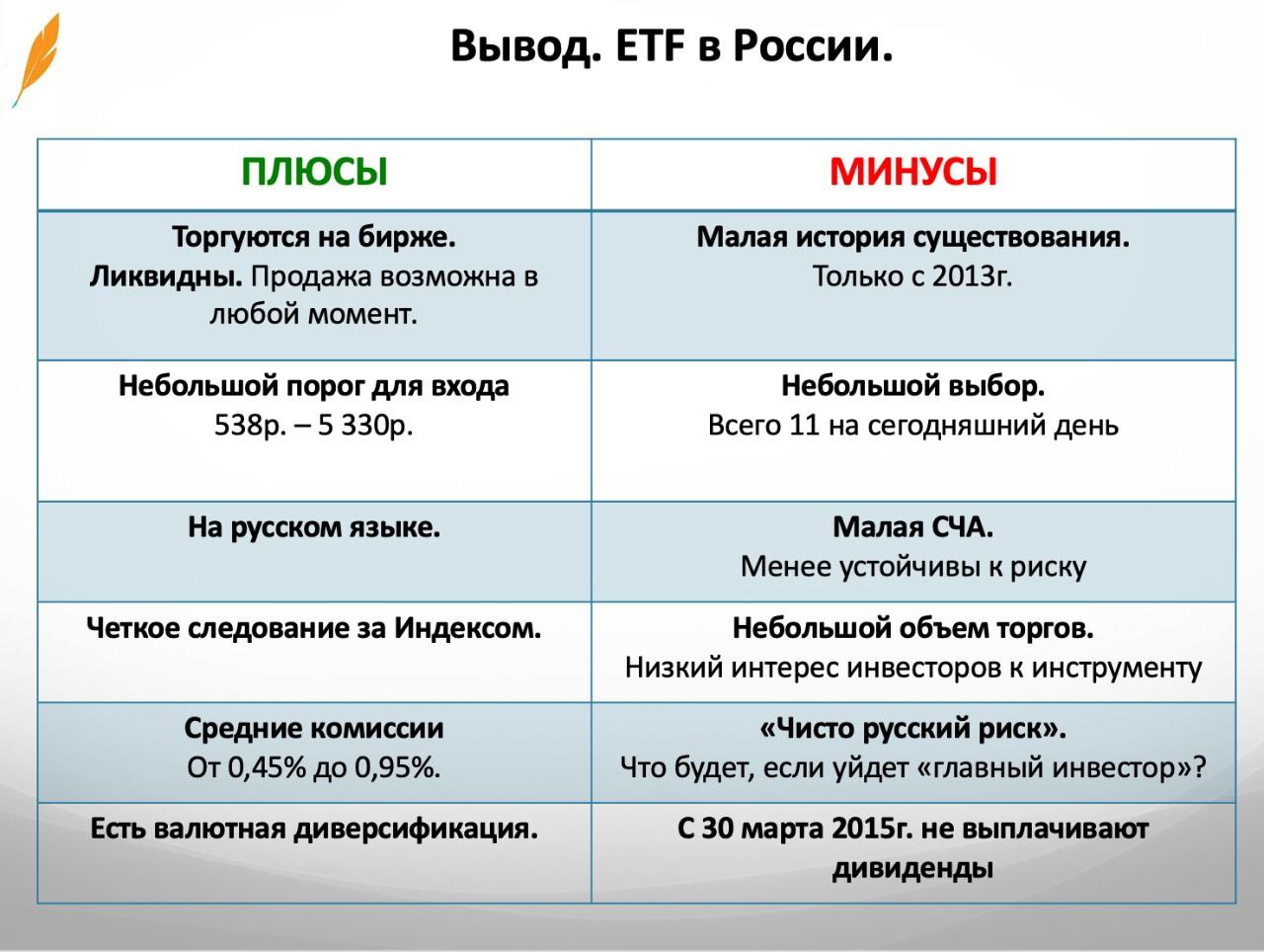 Да, к сожалению, я точно знаю, что некоторые мои коллеги предлагали данные фонды своим клиентам - порой даже в качестве составляющей Резервного фонда, против чего я всегда активно возражала! Более того, привожу слайд из презентации к вебинару “Многообразие зарубежных фондов”. Как видим, дотошный козерог в моем лице, испорченный первым юридическим образованием, еще аж в 2015г. предупреждал как о “малой устойчивости к риску”, так и о “чисто русском риске”. Разумеется, я тогда и предположить не могла, что всё обернется именно такой ситуацией, но… риски - это то, что просматривается всегда, и хорошо бы о них знать как инвесторам, так и их советникам.