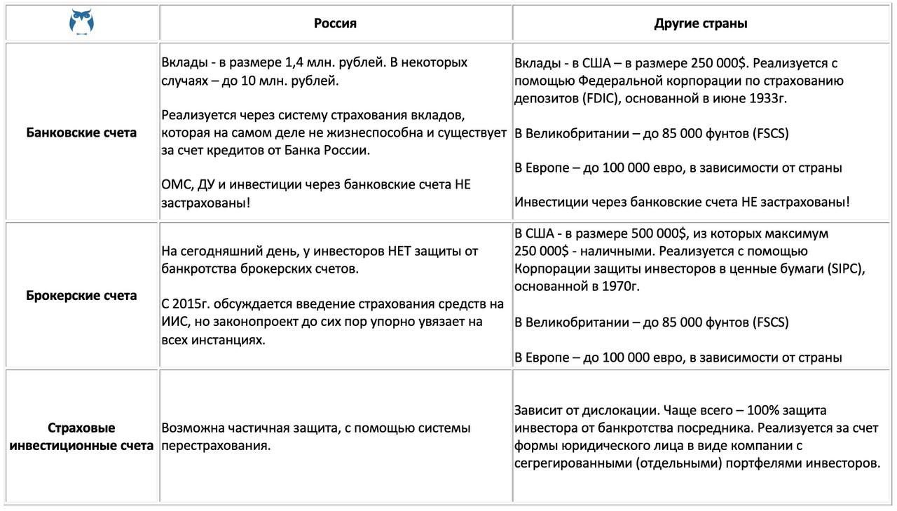 🇷🇺 Россия. На сегодняшний день, у инвесторов НЕТ защиты от банкротства брокерских счетов. С 2015г. обсуждается введение страхования средств на ИИС, но законопроект до сих пор упорно увязает на всех инстанциях.