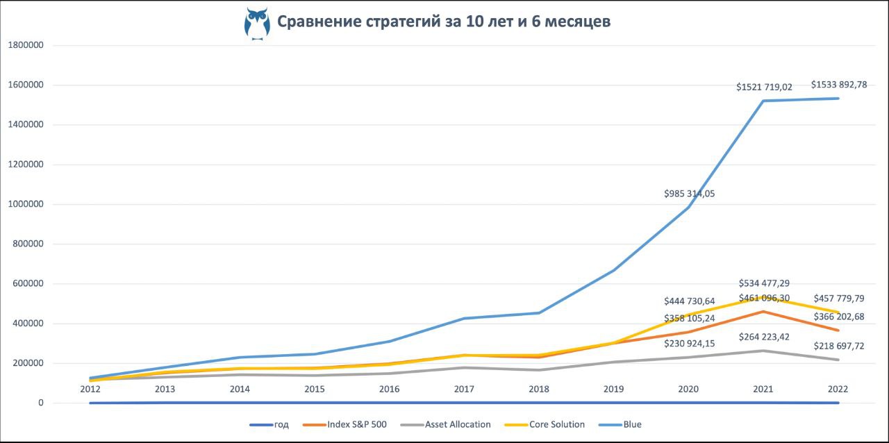💎 А вот тот же инвестиционный портфель, но к которому добавили грамм активного управления. Взболтать, не смешивая, - и получится стратегия Core Solution. Опять же, высоких доходностей ждать он нее не стОит, но небольшая балансировка помогает получить всю ту же среднюю температуру по рынку уже ближе к положительным значениям.