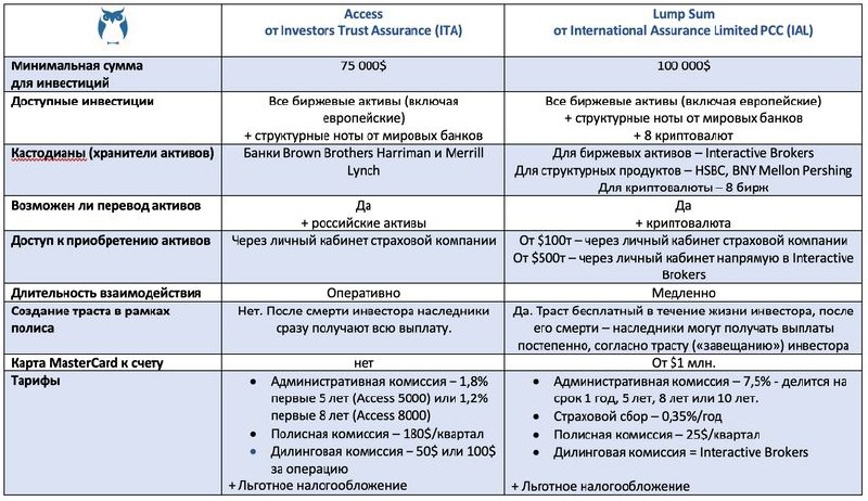 - В IAL возможно создание траста, который бесплатен в течение жизни инвестора и “просыпается” только после его смерти. Соответственно, эта опция хороша при наличии несовершеннолетних наследников, когда нужно четко прописать: что, кому, когда и в каких долях. Если же есть совершеннолетний наследник - то его вполне можно просто вписать в качестве совладельца полиса что в IAL, что в ITA.