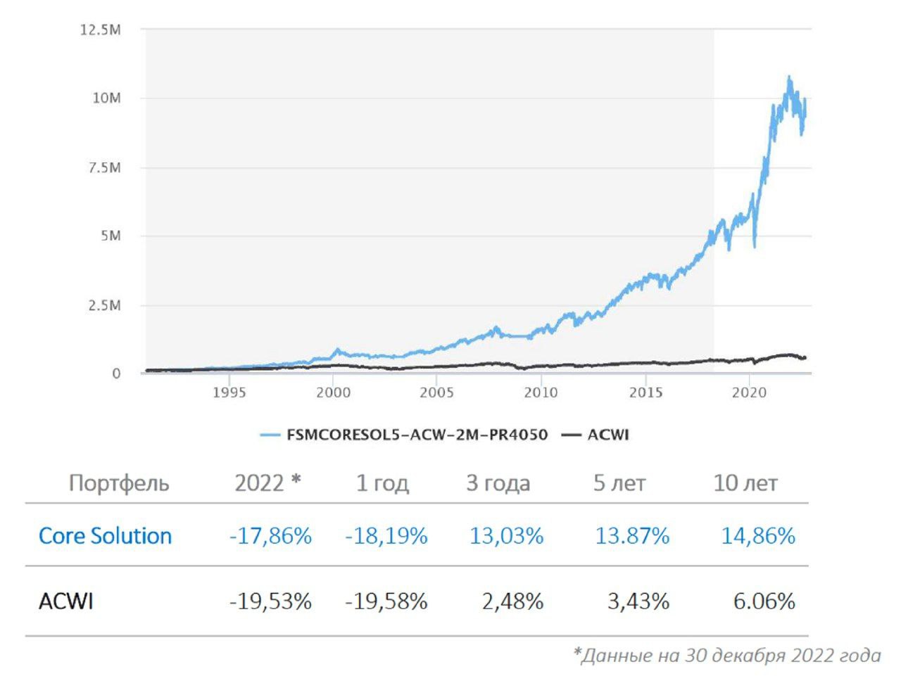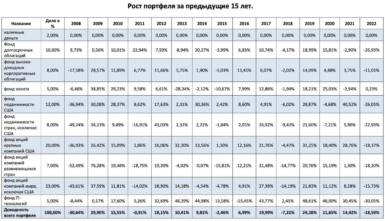 Как видим, данный портфель немного отличается от портфеля J.P.Morgan. Так, например, в данном случае добавлен отраслевой Индекс IT-технологий, вместо широкого фонда товарных активов представлено одно золото, да и процентные соотношения активов разнятся. Однако… плюс-минус данные по годам схожи 👇