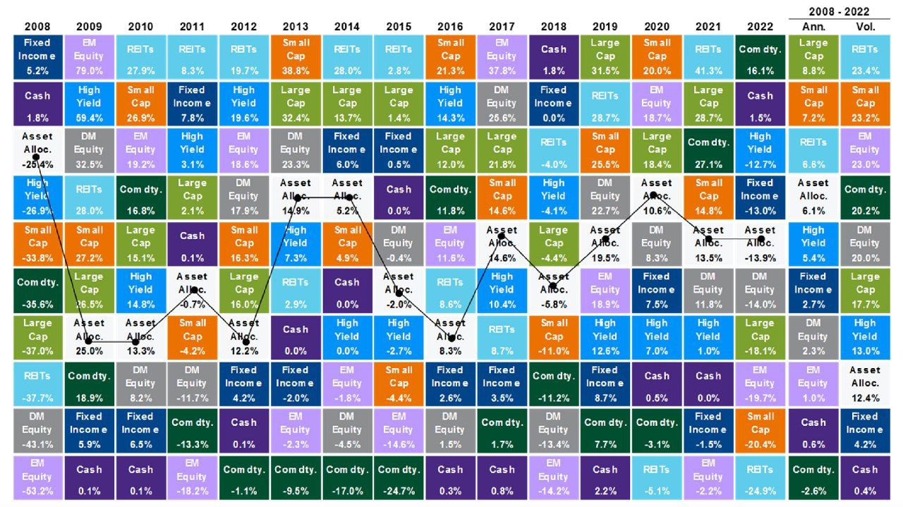 Ладно-ладно, каюсь: насчет «красивое» - это я погорячилась, конечно! Год был тяжелым, что и говорить… Но! Эта табличка из прекрасного отчета J.P.Morgan как нельзя лучше демонстрирует доходность разных классов активов за прошедший год .
