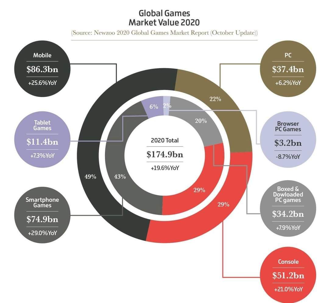 💰 Объём рынка составил 174,9 миллиарда долларов, что на 19,6% больше показателя годом ранее. 49% приходится на мобильный сегмент, 29% — на консольный, и оставшиеся 22% — на ПК.