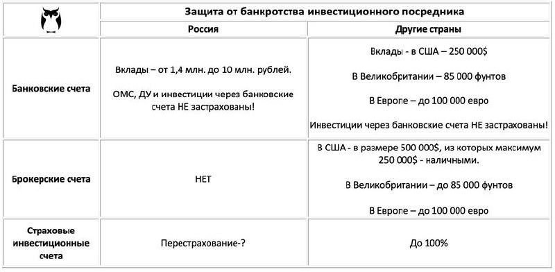 🇷🇺 Россия. На сегодняшний день у инвесторов НЕТ защиты от банкротства брокерских счетов. С 2015г. обсуждается введение страхования средств на ИИС, но законопроект до сих пор упорно увязает на всех инстанциях.