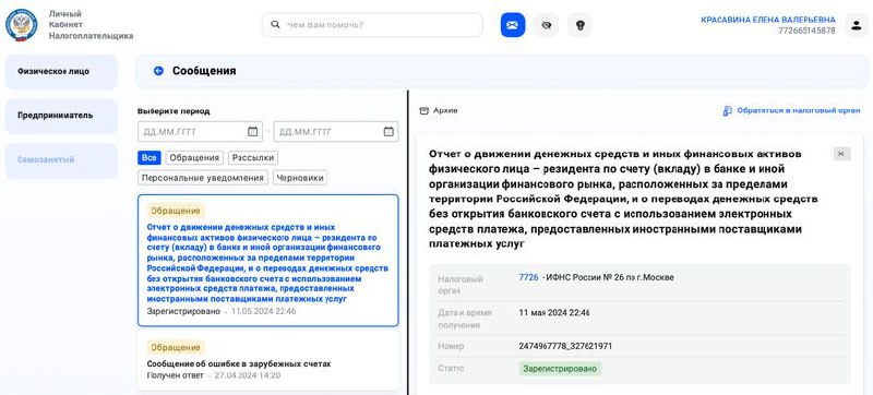 На всякий случай лучше зайти в личный кабинет налоговой и посмотреть: всё ли нормально с принятием отчета. Для этого можно нажать на значок “письмо” на верхней панели и найти ветку “Обращение” по поводу отчета. Если там стоит статус “Зарегистрировано” (см. скрин 👇), то всё хорошо. Редко, но случается, что приходит Уведомление об отказе в приеме из-за ошибок, содержащихся в отчете.