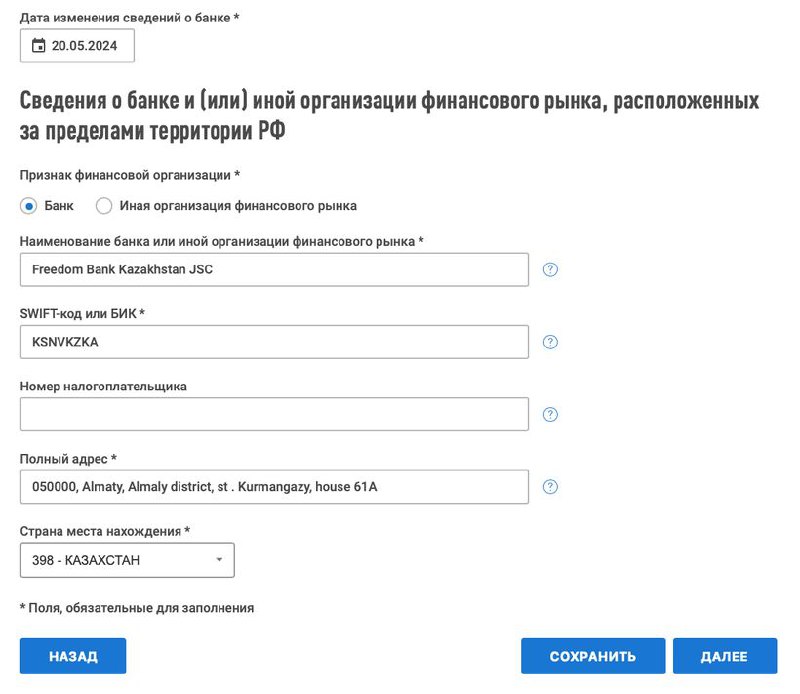 4. В разделе “Сведения о банке, расположенном за пределами территории РФ” меняем только название на Freedom Bank Kazakhstan JSC. Остальные данные остаются старыми - просто копируем их из раздела выше. В результате должно получиться как на скрине 👇