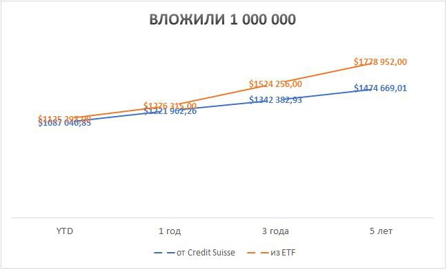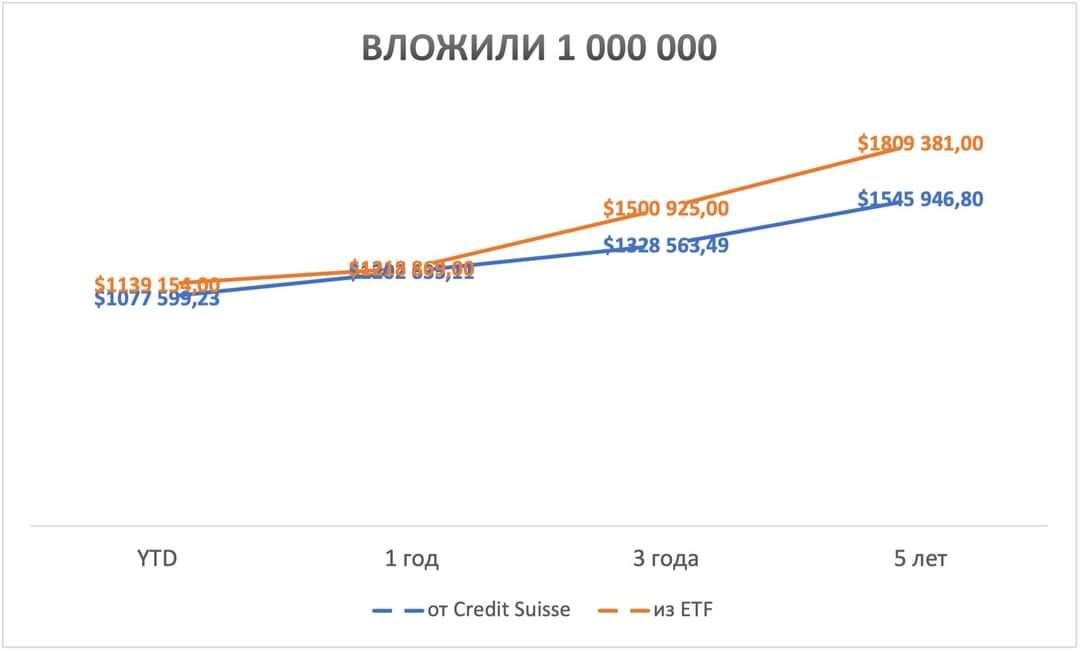 ✅ Однако, если и туда, и туда вложить 1 000 000$, то через год в портфеле от Credit Suisse сумма почему-то меньше, чем в портфеле из ETF’s