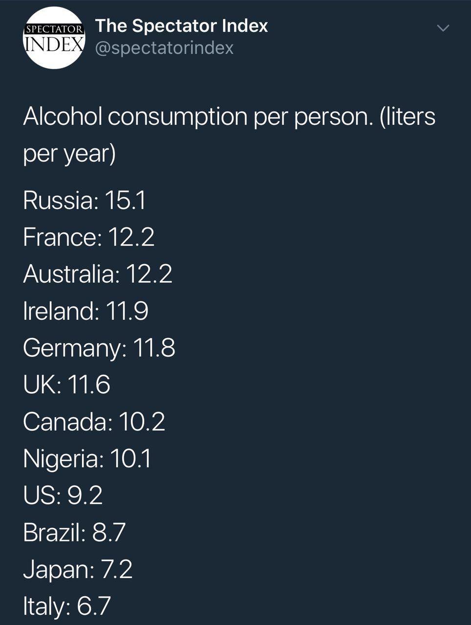 @mudak опубликовал скрин страницы британского журнала «The Spectator index» со свежими данными потребления алкоголя в мире.