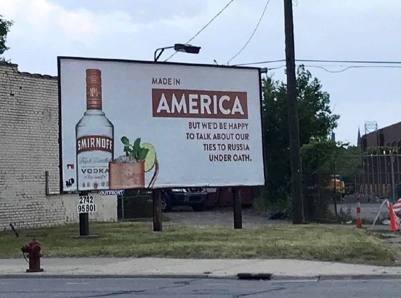 Американская водка «Smirnoff» до сих пор в своей рекламе активно эксплуатирует тему вмешательства России в выборы 2016 года. «Сделано в Америке. Но мы будем рады поговорить о наших связях с Россией. Под присягой» ― гласит актуальный рекламный слоган.