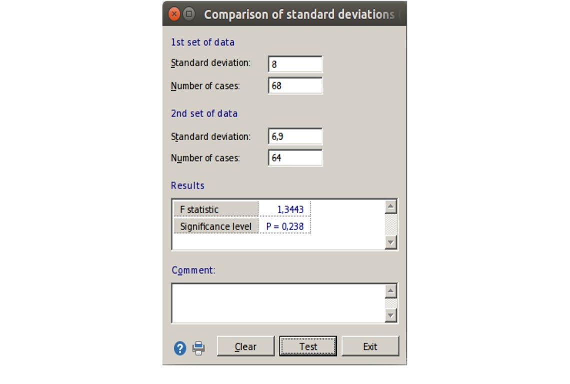 Ну что ж, забыли, бывает. Давайте им поможем. Для этого воспользуемся F-тестом для сравнения стандартных отклонений в MedCalc. Как вы можете увидеть на скриншоте[4], уровень статической значимости 0,238, что очень далеко от общепринятого уровня 0,05.