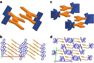 a–d, Crystal structures of the 1CzTrz-F (a,b) and 3CzTrz-F (c,d) compounds, determined by XRD. a,c, Diagrams of the two dimers of both crystallographic unit cells to show the molecular packing. b,d, Spatial arrangement of the acceptor–donor contacts in the 3D crystal structure. The triazine acceptor and the carbazole donor units are coloured orange and blue, respectively. The green features in d indicate co-crystallized chloroform molecules. (Credit: Oskar Sachnik et al., 2023)