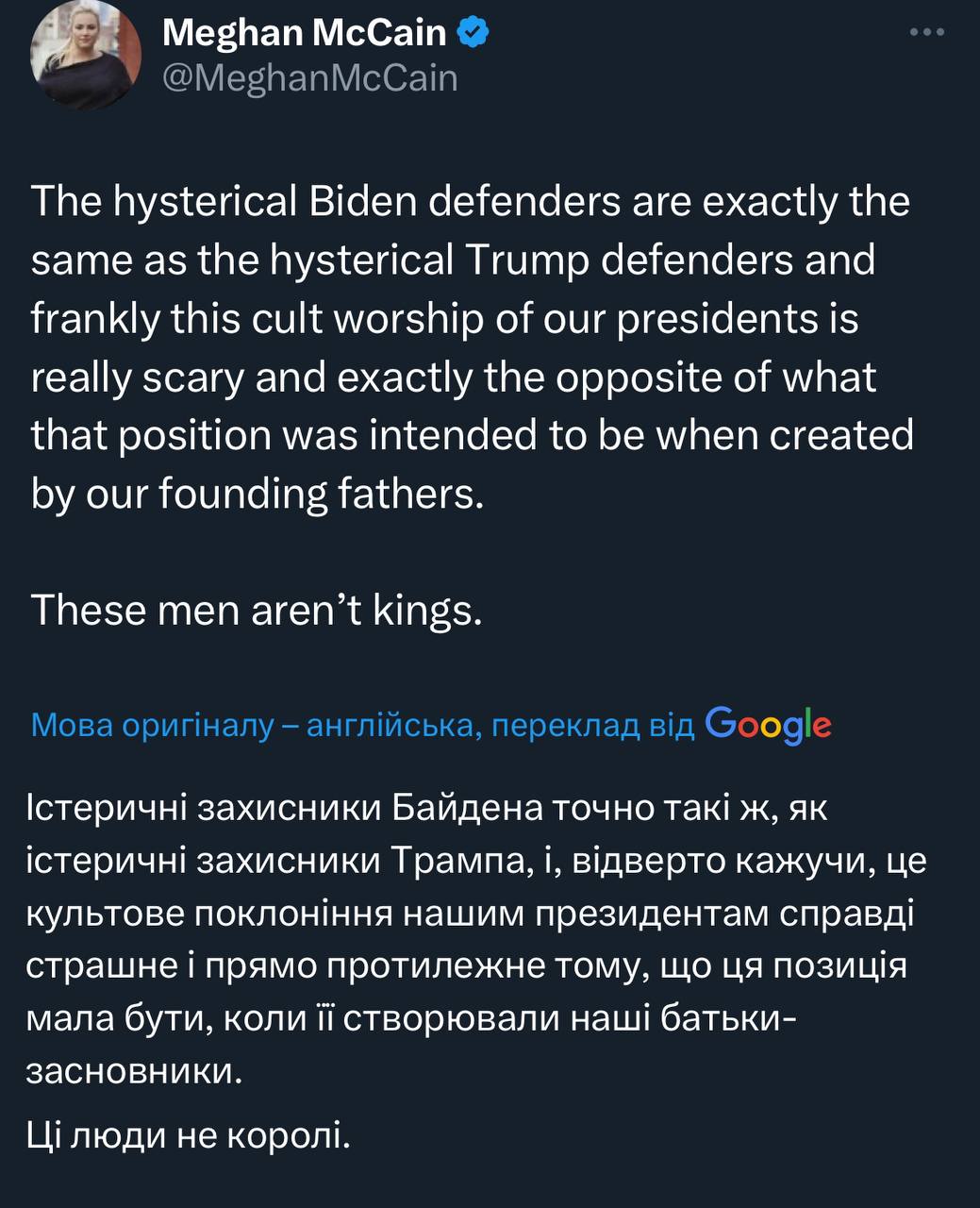 Дочка Маккейна все вірно каже. Культ особистості, який розквітнув останнім часом, повна хуйня, якому б ідолу не поклонялись 🤷♂️