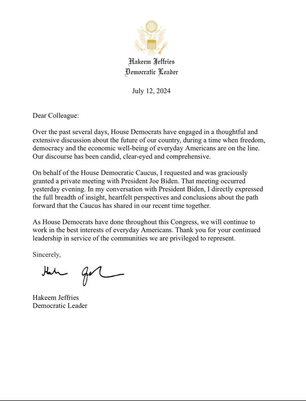 Лист лідера демократів Палати Хакіма Джеффріса за результатами зустрічі з Байденом.