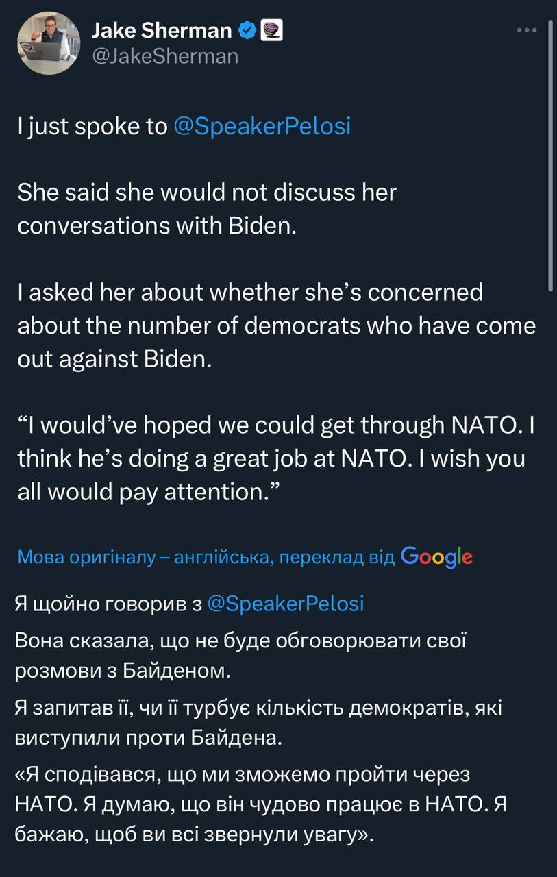 За словами однієї особи, близької до Пелосі, ці коментарі мали послужити тонким зеленим світлом, щоб заохотити інших демократів висловитися про своє бажання бачити зміни на вершині квитка — і попередити Байдена, щоб він передумав залишатися в перегонах".🤷♂️