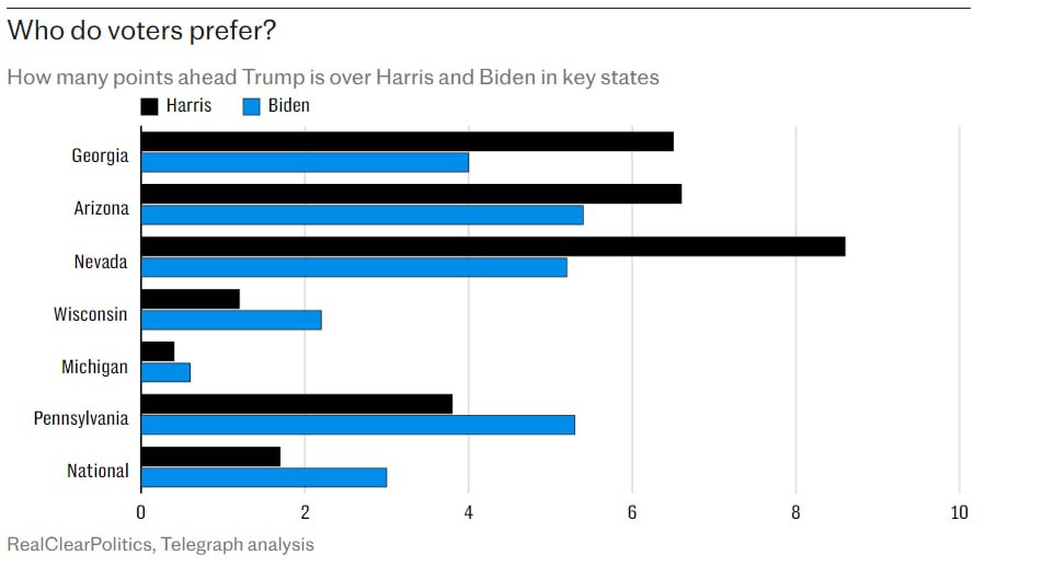 На скільки пунктів Трамп попереду Байдена (синя) і Харріс (чорна) в ключових штатах.