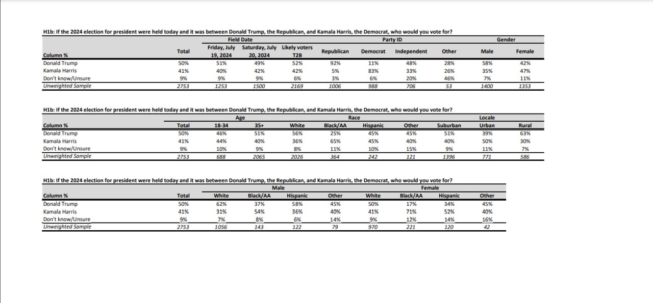 Щоправда опитування проводилось 19-21 липня до рішення Байдена вийти з гонки, тому як це вплинуло поки не зрозуміло.