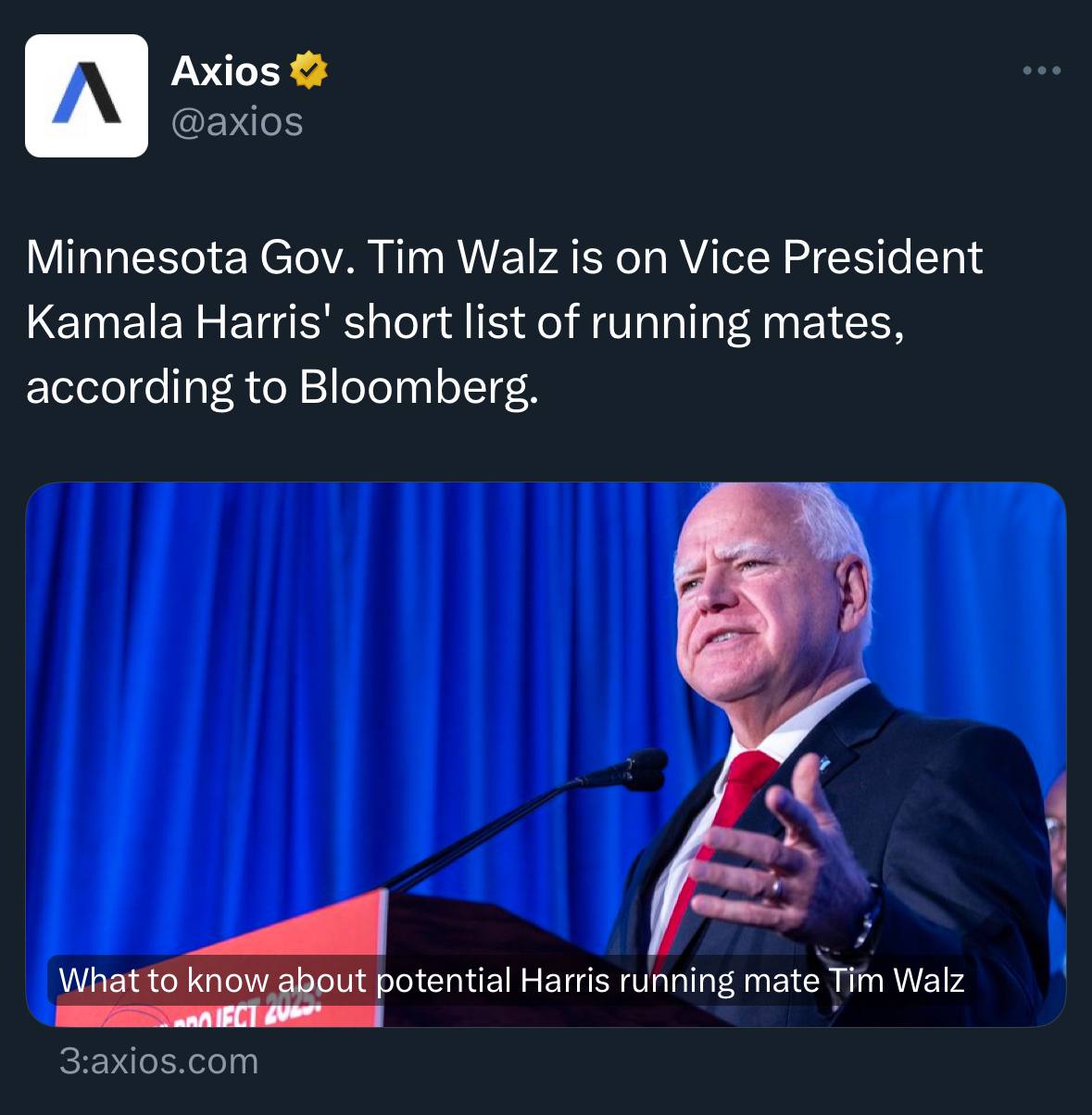 Просто не треба нічого вигадувати. Тім Волз не користується ніякою широкою любов'ю ніяких ані фермерів, ані мідвестерн білих чоловіків, ані поміркованих, ані незалежних. Його сунули і люблять активісти, прогресисти і онлайн-горлопани. Тому він нічого не додає в квиток і обраний за принципом "аби не втратити ідіотів з баррикад і лівих істеричек онлайн", а нормікі хай закриють рота і голосують за нас, адже там "дивний Трамп". Ось вся суть цього обрання.
