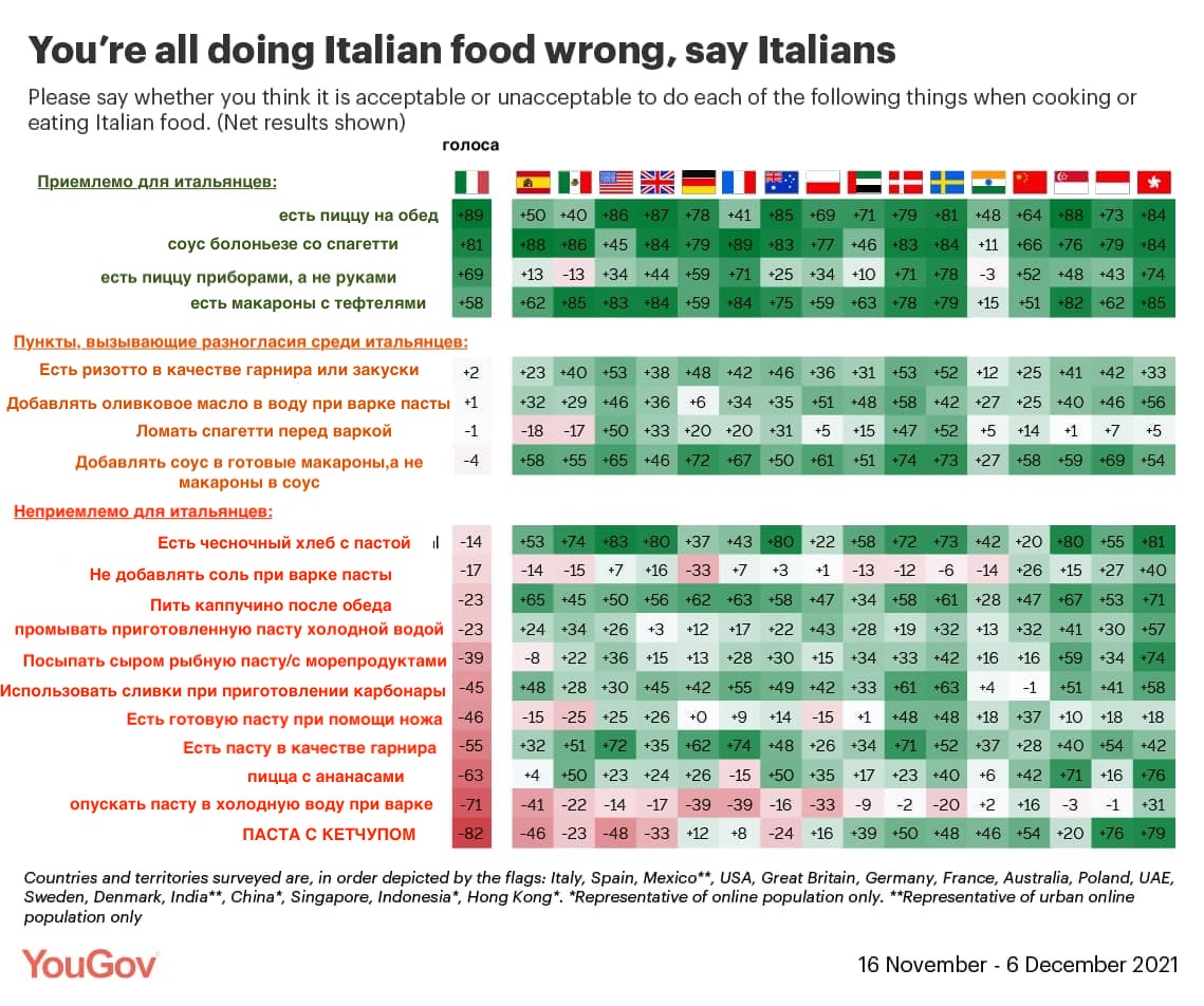 Принесли вам совершенно прекрасную картинку! На ней собраны все смертные грехи итальянской кухни (по мнению итальянцев, конечно же) — от приемлемого, вроде «есть пиццу ножом и вилкой» до страшного кошмара любого итальянца, типа «пить каппучино после обеда». Также по таблице интересно посмотреть ответы людей из других стран. К сожалению, там нет России. Думаю среднестатистический житель нашей страны грешит примерно по всем пунктам 😀