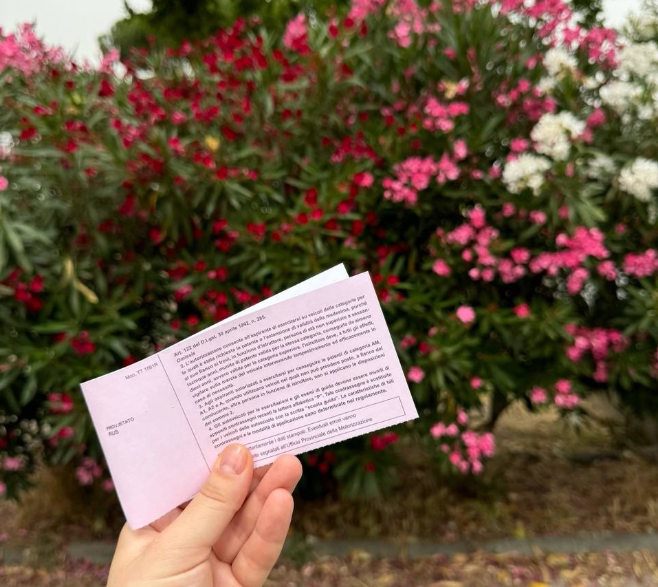 Листочек называется foglia rosa (розовый листок). Это пока еще не права, но уже большой шаг на пути к ним. С ним, например, можно уже водить машину: для этого рядом должен сидеть кто-то со стажем вождения больше 10 лет + нужно наклеить на машину наклейку P (principante=начинающий).