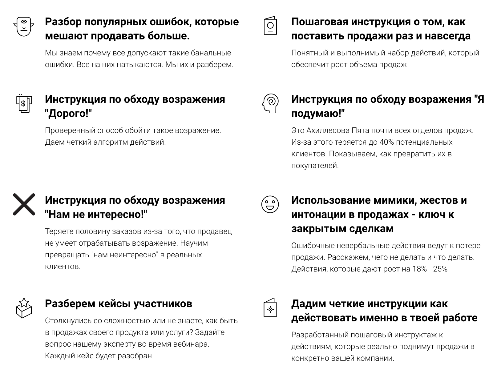 Могу с уверенностью сказать, что этот подход позволит вам сэкономить время на тех, кто пытается отморозиться и просто тратит вообще время и силы на бесполезную отработку возражений, поможет таковых приблизить к покупке и даст существенный прирост к закрытым сделкам. Так как вы не даёте возражать, вместо этого вы опережаете потенциальные возражения.