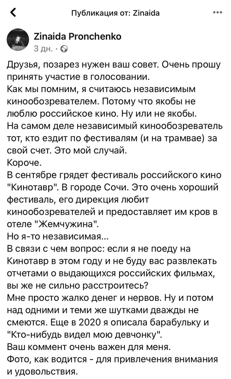 До «Кинотавра» еще месяц, а самопровозглашенная «звезда от критики» Зинаида уже интригует, устраивая опрос в соцсетях «не умрете ли вы, если я не поеду на «Кинотавр»?