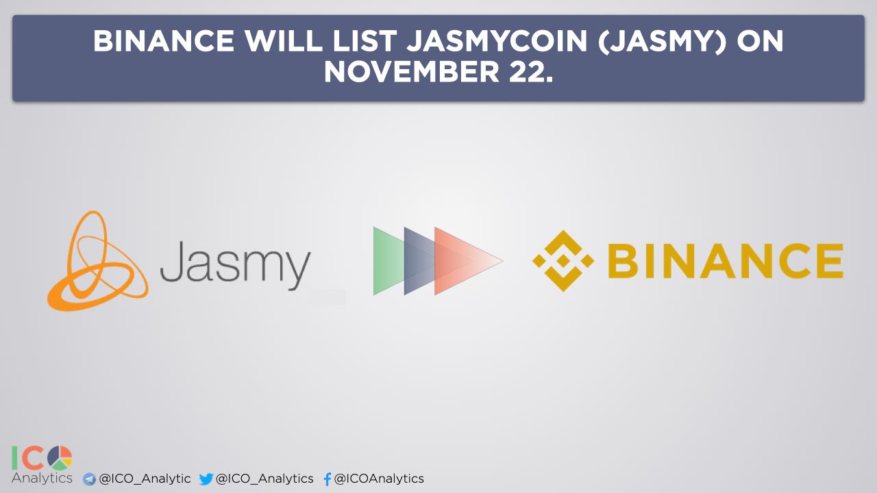 ββBinance will list JasmyCoin (JASMY) on November 22. JASMY/BTC, JASMY/BNB, JASMY/BUSD, and JASMY/USDT trading pairs will go live at 12:00 (UTC).