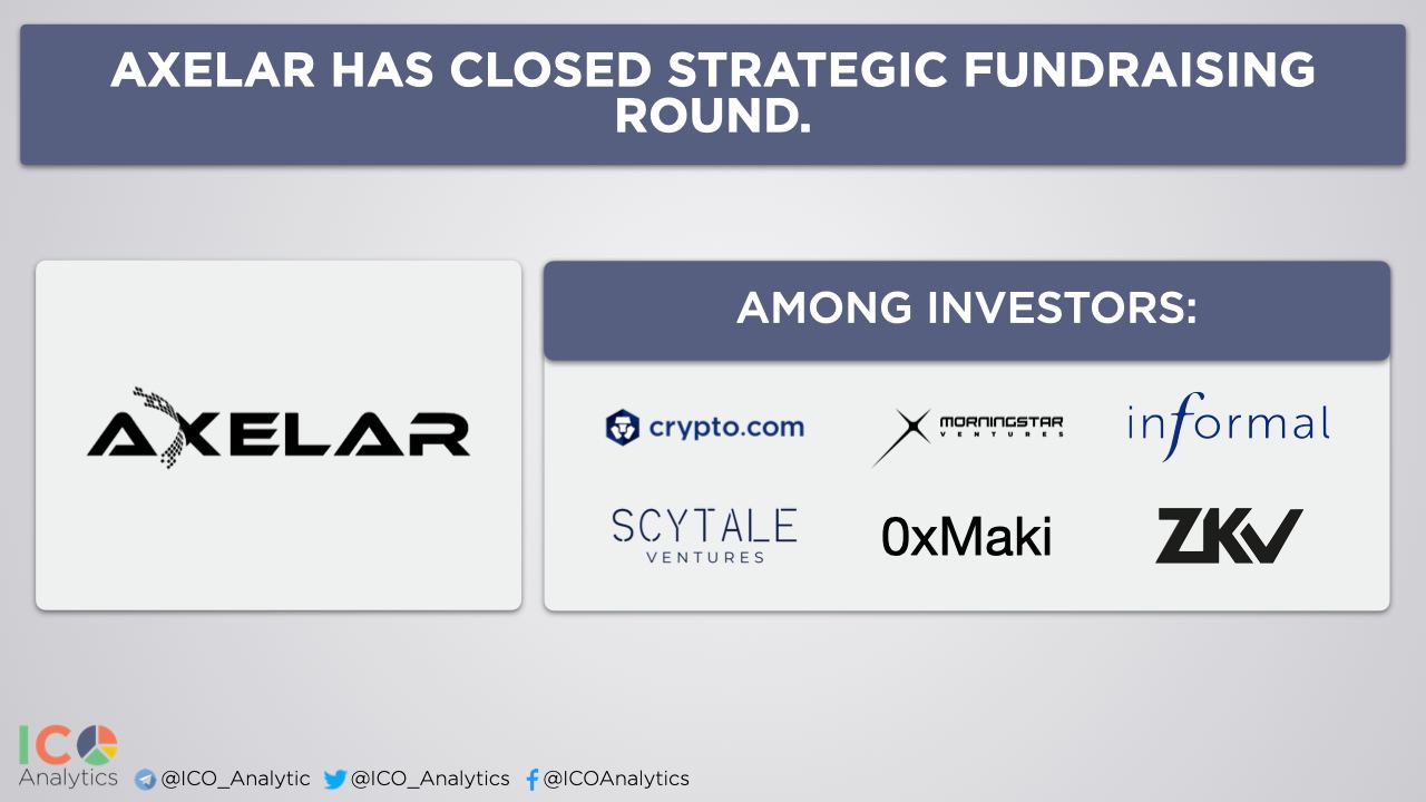 ββAxelar has closed strategic fundraising round. The amount raised is not disclosed. CryptoCom was leading the round. Systems Inc, SushiSwap's co-founder, 0xMaki, Morningstar Ventures, Scytale Ventures and Zero Knowledge Validator are among investors. Axelar is building a decentralized network and tools that connect users, assets, and dApp across multiple blockchain ecosystems.