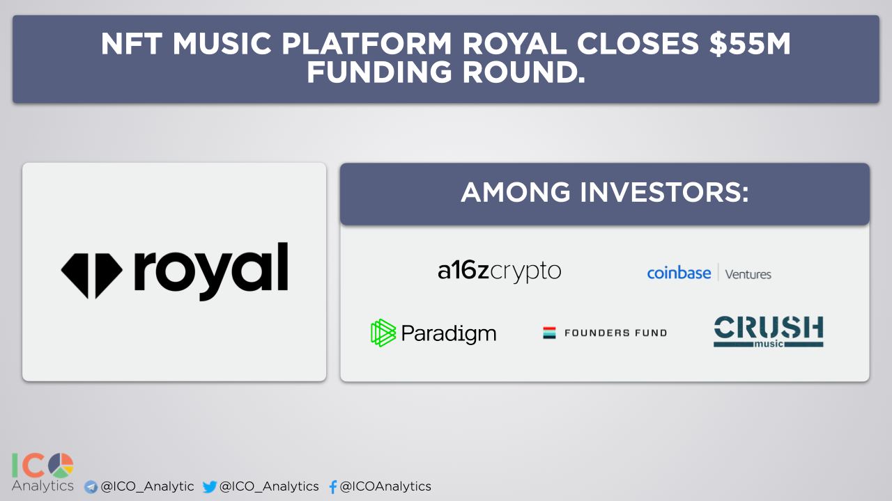 ββNFT Music platform Royal closes $55M funding round. a16z, Coinbase Ventures, Paradigm, Founders Fund and Crush Music are among investors. Led by DJ 3LAU, Royal allows anyone to purchase the right to earn royalties from their favorite songs.