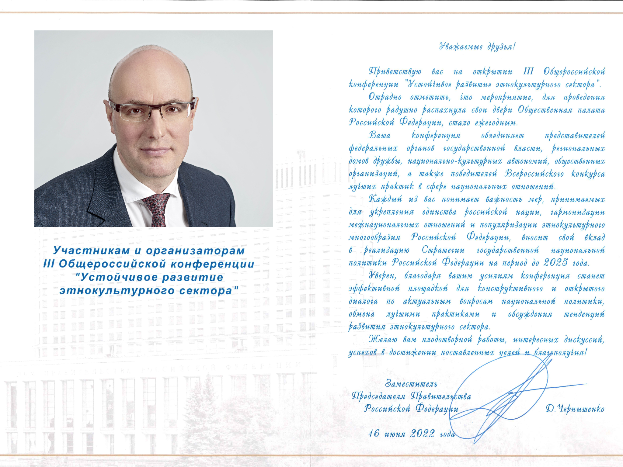 Приветствие участникам III Общероссийской конференции "Устойчивое развитие этнокультурного сектора" направил заместитель Председателя Правительства Российской Федерации Дмитрий Чернышенко: