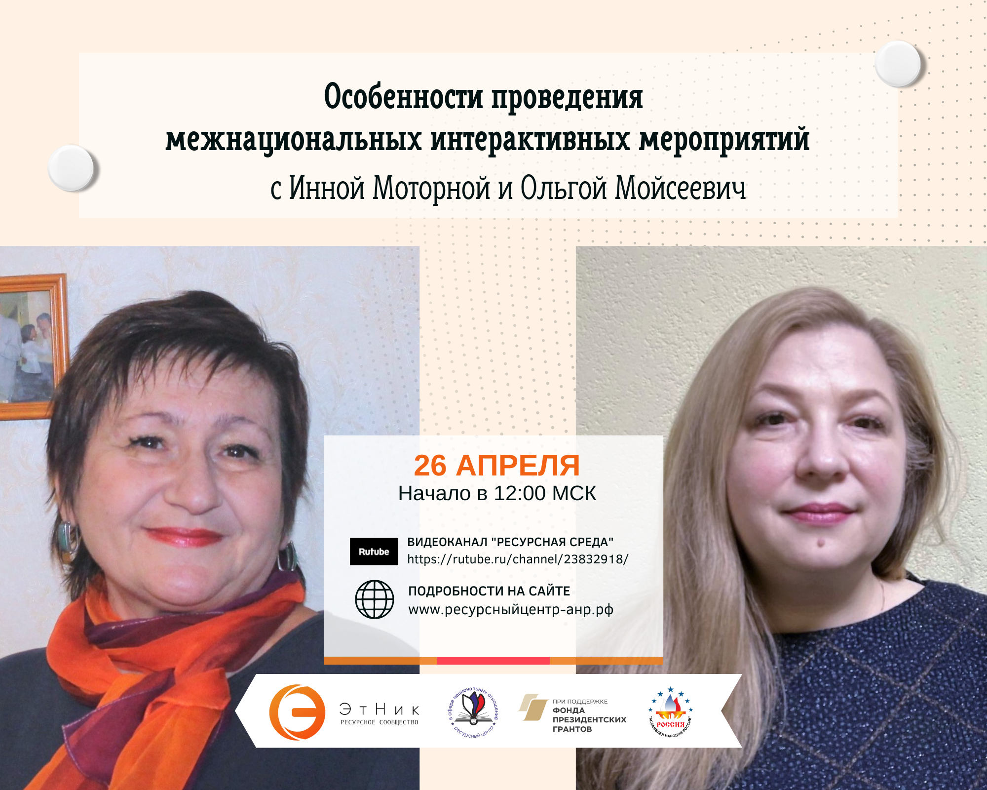 Вебинар состоится в рамках всероссийского проекта «ЭтНик: ресурсное сообщество», который разработан и реализуется Ресурсным центром в сфере национальных отношений в партнёрстве с Ассамблеей народов России с использованием гранта Президента Российской Федерации на развитие гражданского общества, предоставленного Фондом президентских грантов.