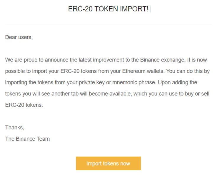 Пользователям начали приходить письма о том, что теперь можно импортировать на Binance ERC-20 токены со своих Ethereum кошельков. Кнопка в имейле естественно ведет на поддельный сайт биржи, где пользователи могу ввести свои приватные ключи. Будь очень осторожны. Пользуйтесь только проверенными ссылками на Binance, добавляйте ссылку в закладки. Берегите себя и свои деньги!