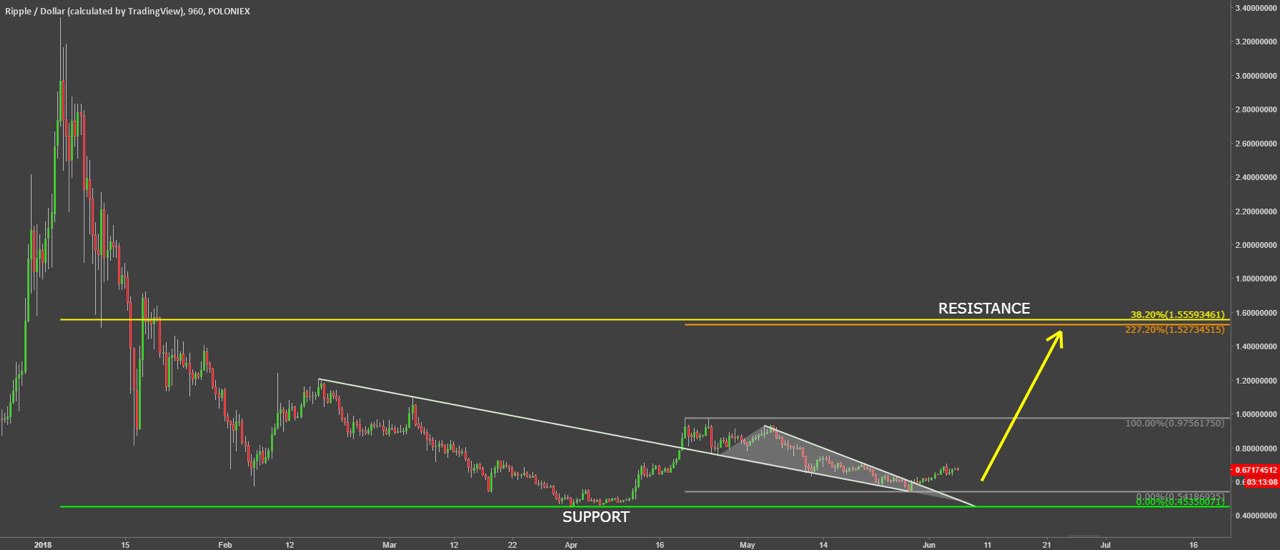 🤔После недавней коррекции, Ripple нашел дно на уровне $0.54, где монета оттолкнулась от нисходящего тренда, которая выступала в качестве уровня поддержки. Затем цена выросла выше текущей трендовой линии и сейчас есть предположения о росте.