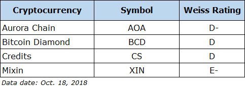 Агентство Weiss Ratings присвоило рейтинг D+ многим проектам, включая Aurora Chain (AOA), Bitcoin Diamond (BCD), Credits (CS) и Mixin (XIN). Они отметили, что:
