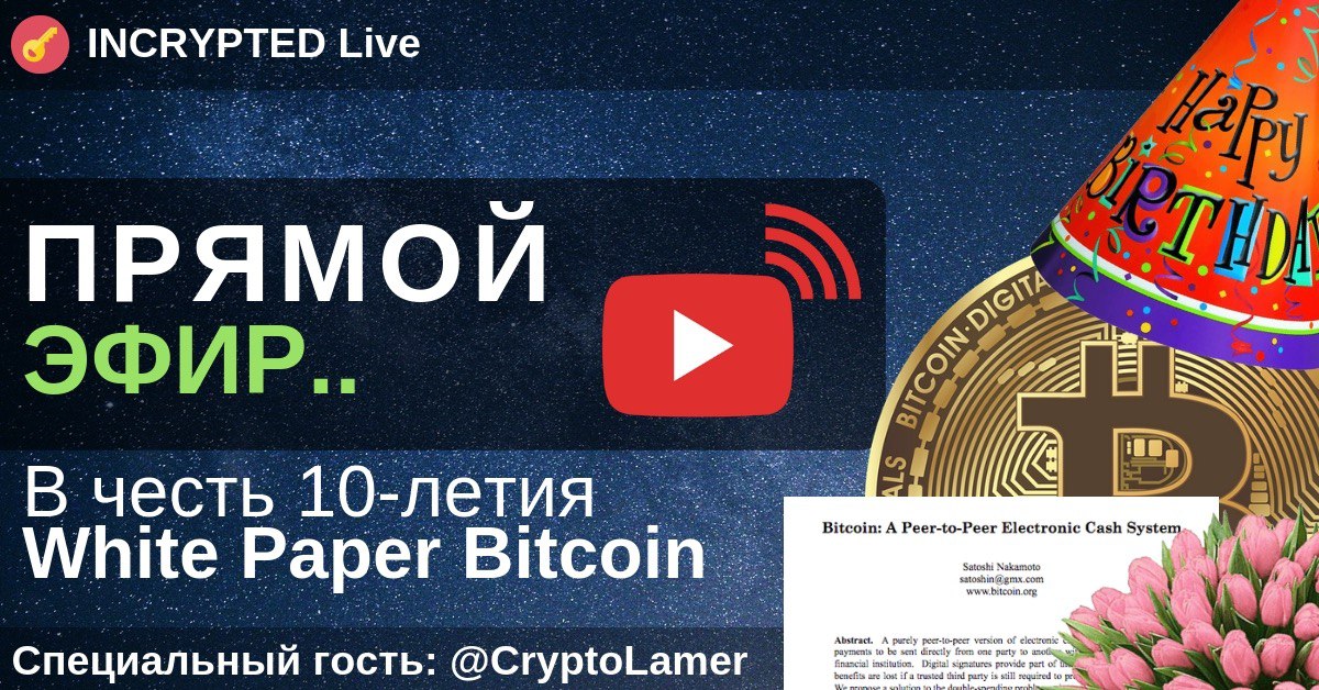 Тематический Stream в честь десятилетия BTC White paper. Наш специальный гость @CryptoLamer в прямом эфире поможет нам лучше разобраться в том, с чего начинался Биткоин, что нужно для массовой популяризации. Ответит на вопросы о LN RSK и асинхронном шифровании…