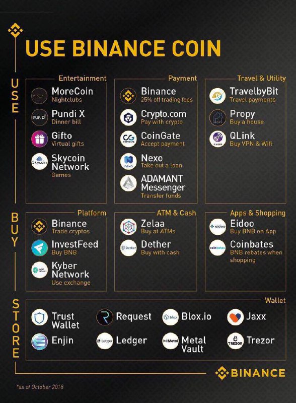 Биржа Binance нарисовала интересную инфографику, где показала, какие операции можно проводить с BNB. Кроме как HODL и оплаты комиисси, можно оплатить в ночных клубах, оплатить путешествия и купить дом! Как тебе такое, Илон Маск?