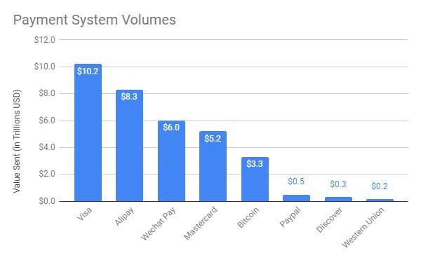 По данным Satoshi Capital Research, объем транзакций BTC в 6 раз больше, чем у PayPal и в 16,5 раз больше чем у Western Union. Такие данные были за 2018 год и объем транзакций превысил $3.3 трлн.